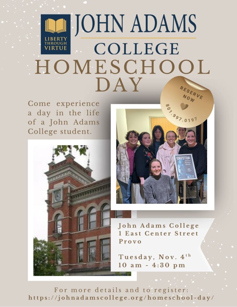 Your homeschooled students, ages 16-18, are invited to join us at John Adams College in Provo for a unique homeschool day, where they will meet some of the faculty and students and will have the opportunity to sit in on a class or two.